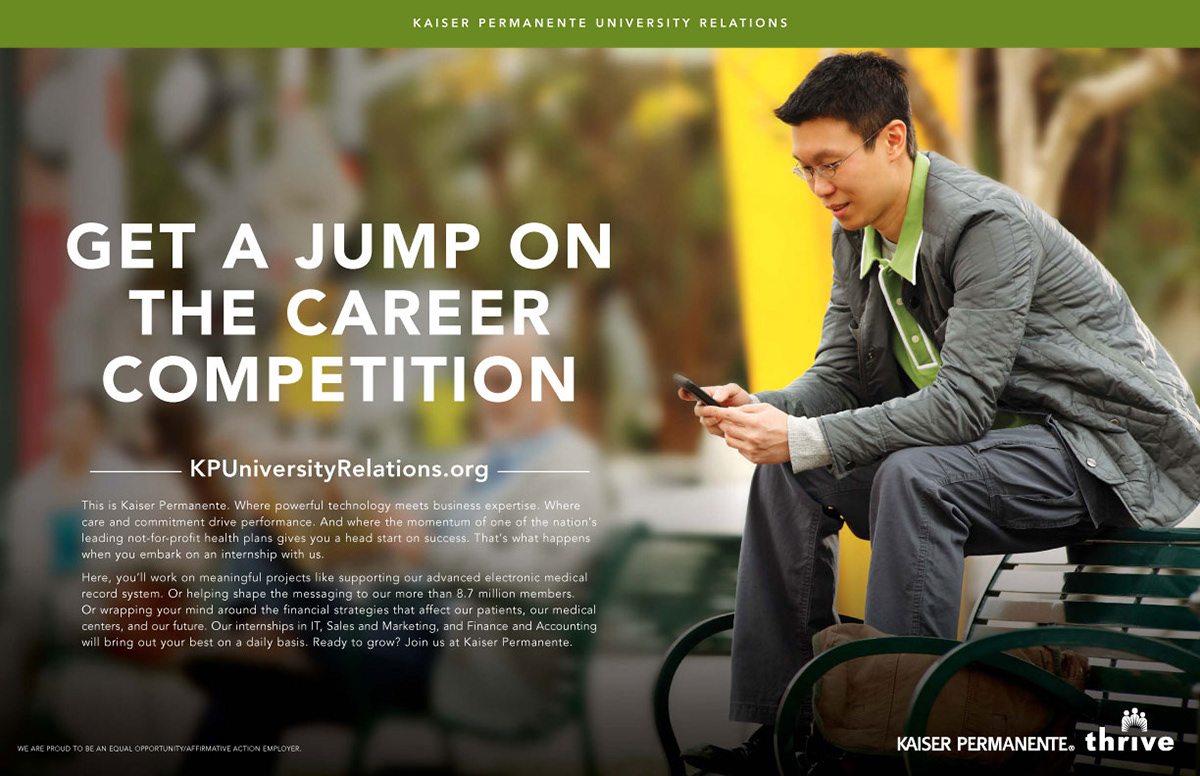 Finding one's motivation, tapping into that potential, and driving for improvement every day. These are things that describe Kaiser Permanente from an organization-wide vantage. They also have some direct parallels to the type of students the organization wishes to recruit into internship positions: people who are go-getters; who take initiative; who have excelled in their studies and are ready to pursue their path to success. These are the people who will define the future of health care. And Kaiser Permanente is the place for them to do it. The culture and scope of the organization means they have the resources and support to stay challenged and engaged as they tap into their potential with an internship at Kaiser Permanente.